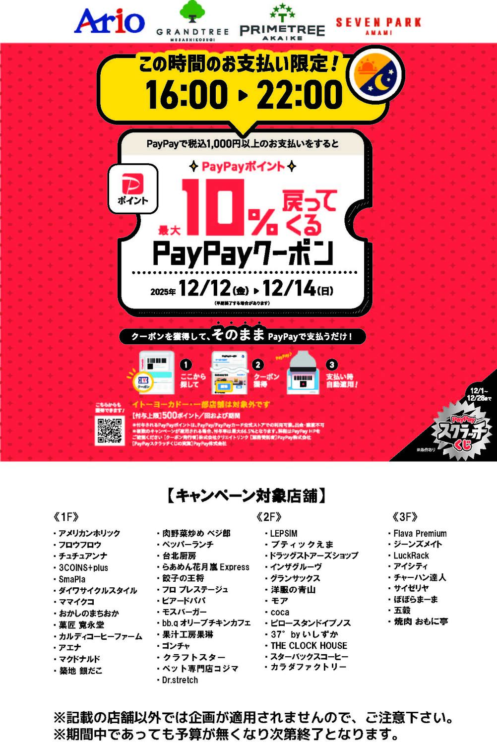 アリオ、グランツリー武蔵小杉、プライムツリー赤池、セブンパーク天美で「夜だけ限定」10%戻ってくるお得なクーポン
