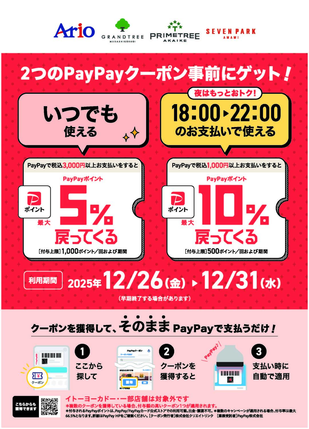 アリオ、グランツリー武蔵小杉、プライムツリー赤池、セブンパーク天美で「昼も夜もお得!」限定クーポン配布