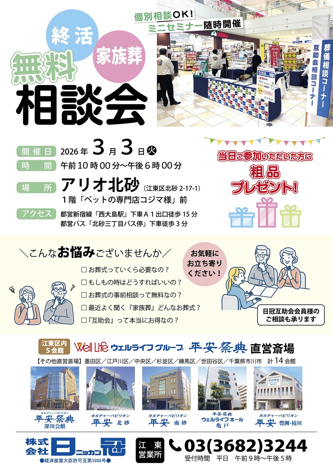 【3/3(火)】(株)日冠 【無料】 家族葬・終活相談コーナー開催♪