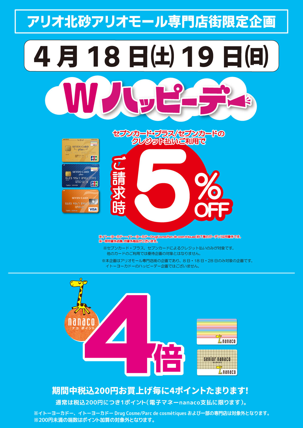 【アリオ北砂アリオモール専門店街限定企画】4/18(土)19(日)限定企画 Wハッピーデー
