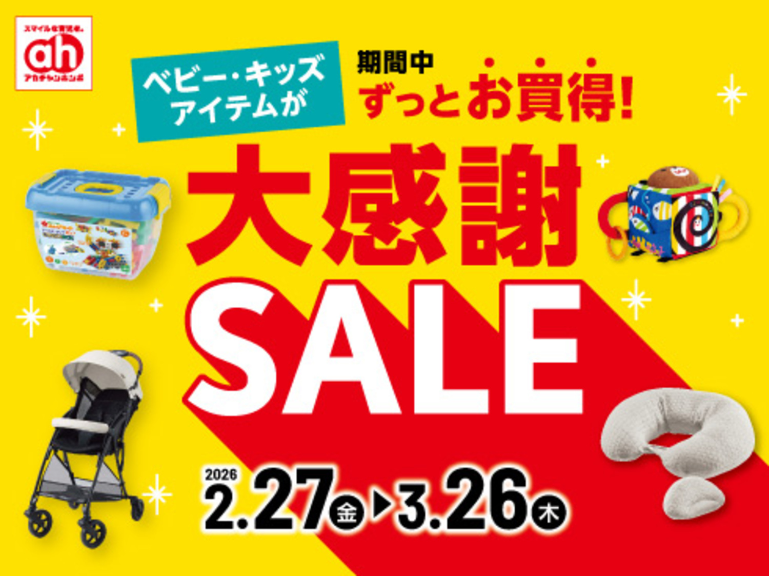 日頃のご愛顧への感謝を込めて、大感謝セールを開催! Gakkenのニューブロックや「しましまぐるぐる」のおふろえほんなどが、期間限定 特別価格で登場! この他にもミッフィーのファーストトイセットやミルトンの子育て応援セットなど、 価格とポイントでお得還元のアカチャンホンポに、ぜひご来店くださいね♪ 詳しくはこちら